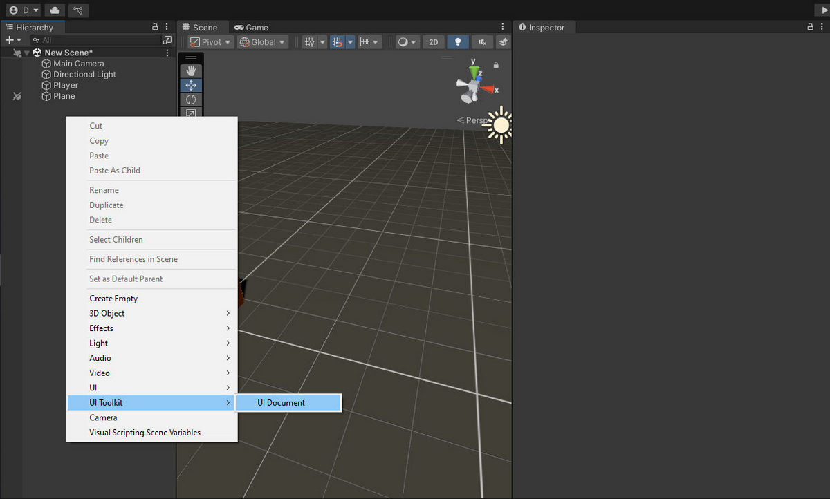 To add a UI Document, right-click the hierarchy and select UI Toolkit > UI Document.