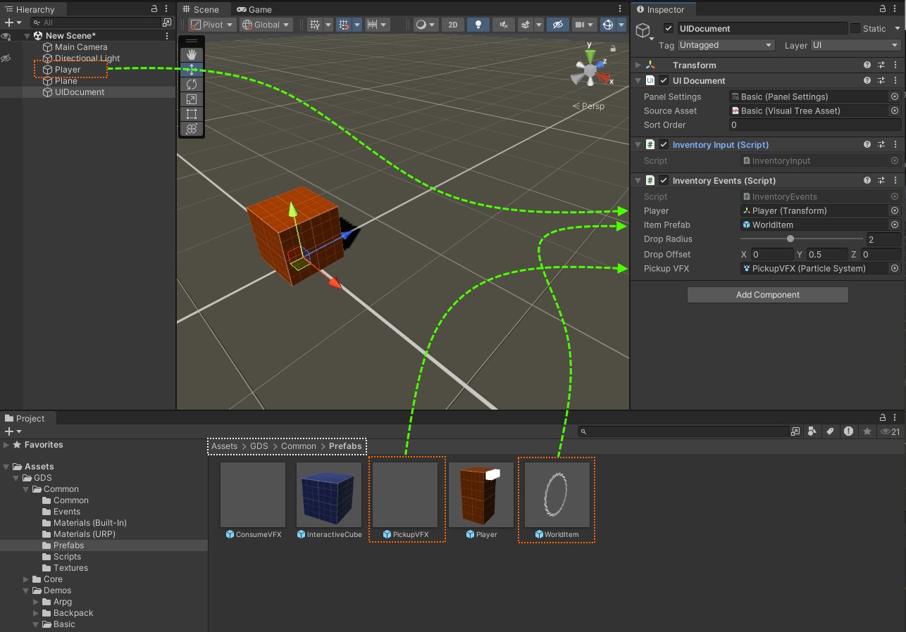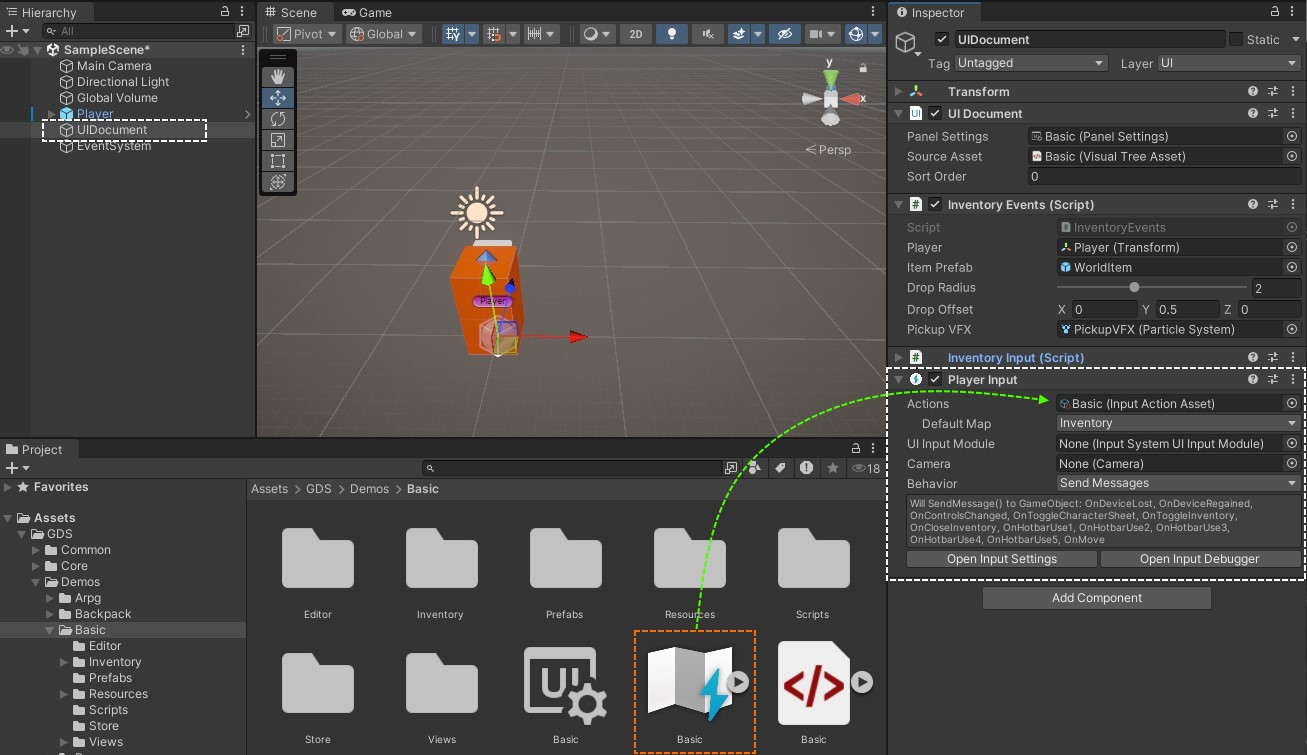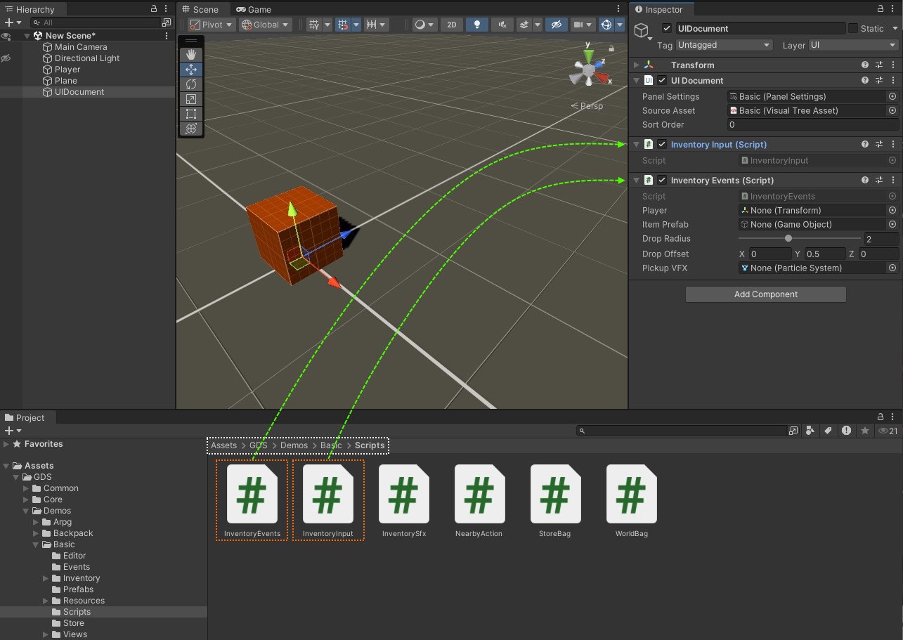 Go to Demos/Basic/Scene/Scripts and add the InventoryEvents and InventoryInput scripts to the UI Document object.