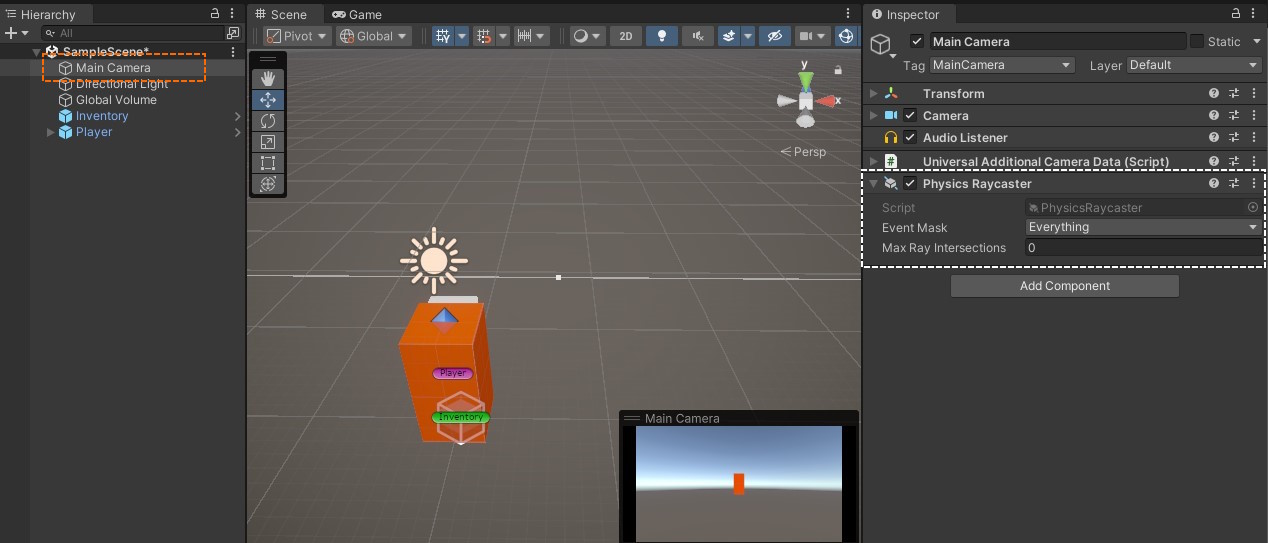 The Physics Raycaster is needed on the main camera so that the new Input System’s UI and event system can detect and interact with 3D objects through raycasts.
