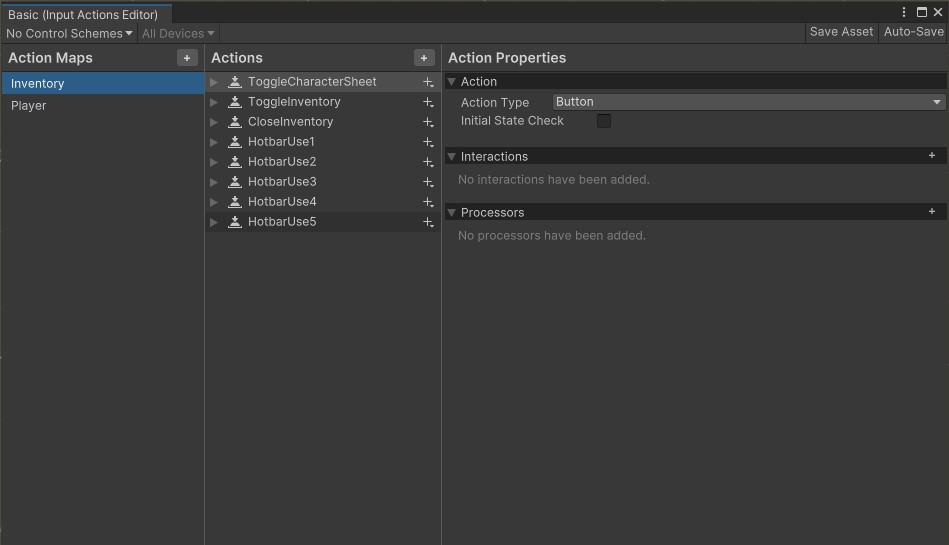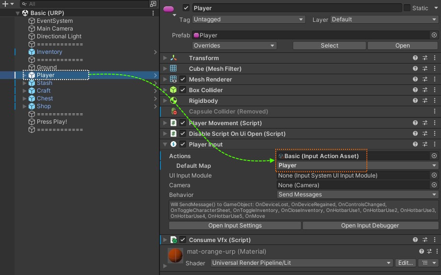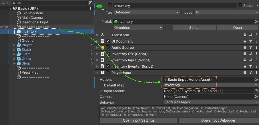 As their names suggest, the mappings should be correctly assigned in the Player Input script, for Inventory and Player objects respectively.