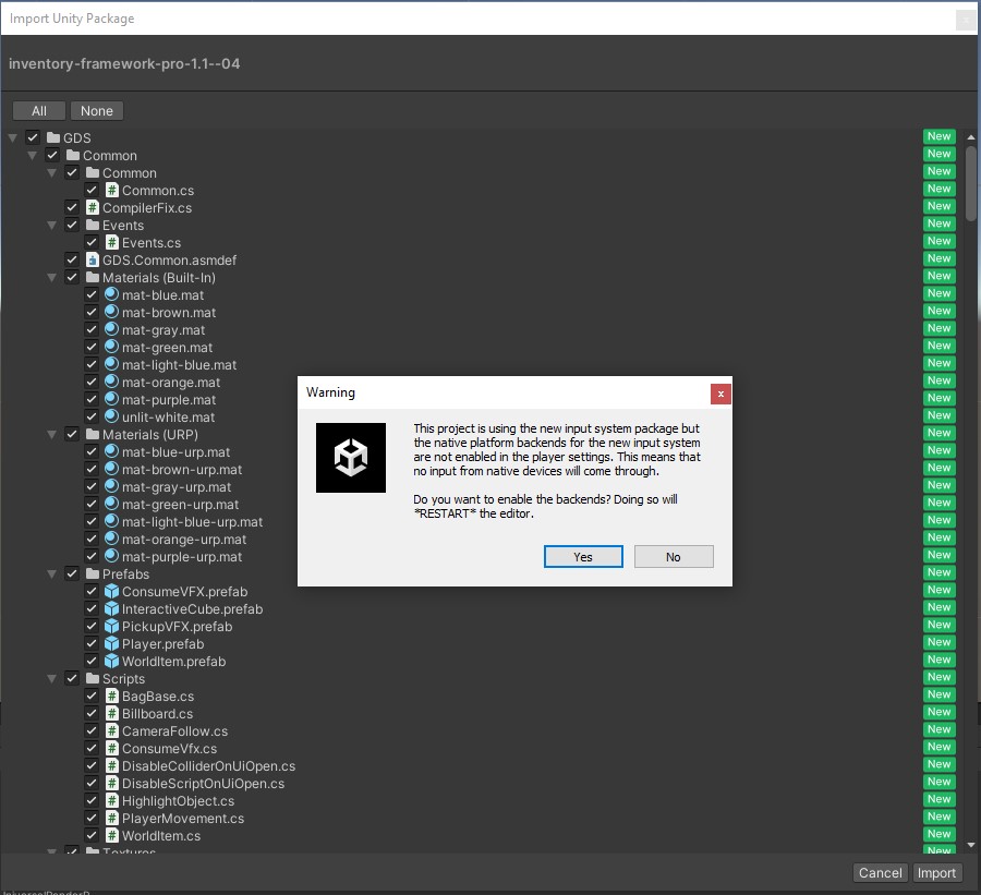 When installing or updating the Inventory Framework asset, you will be prompted to install the Input System package.