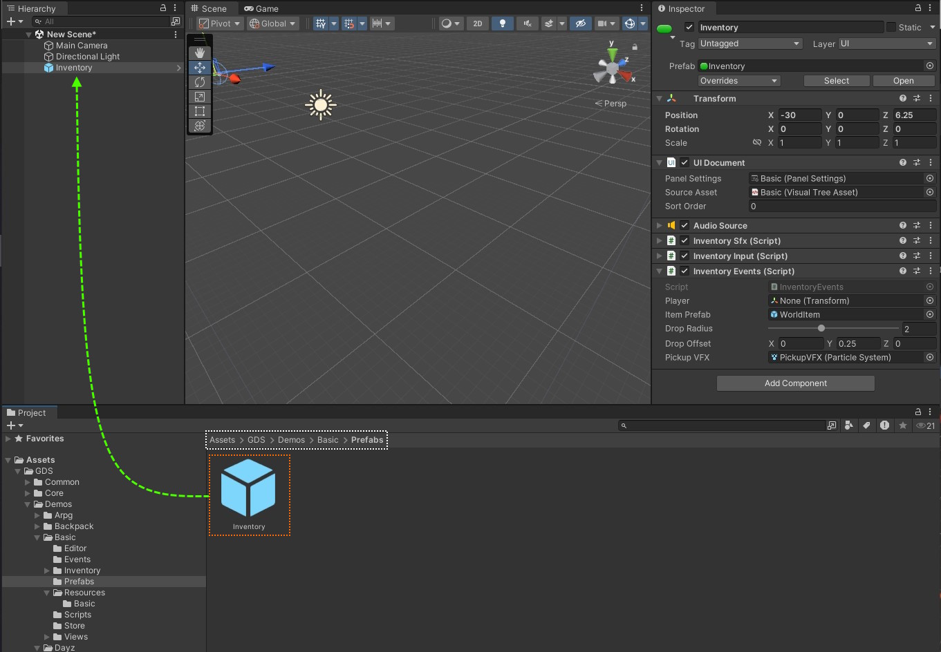 Navigate to the desired demo folder (GDS/Demos/Basic in this example), and drag the Inventory prefab from the Prefabs folder into your scene hierarchy.